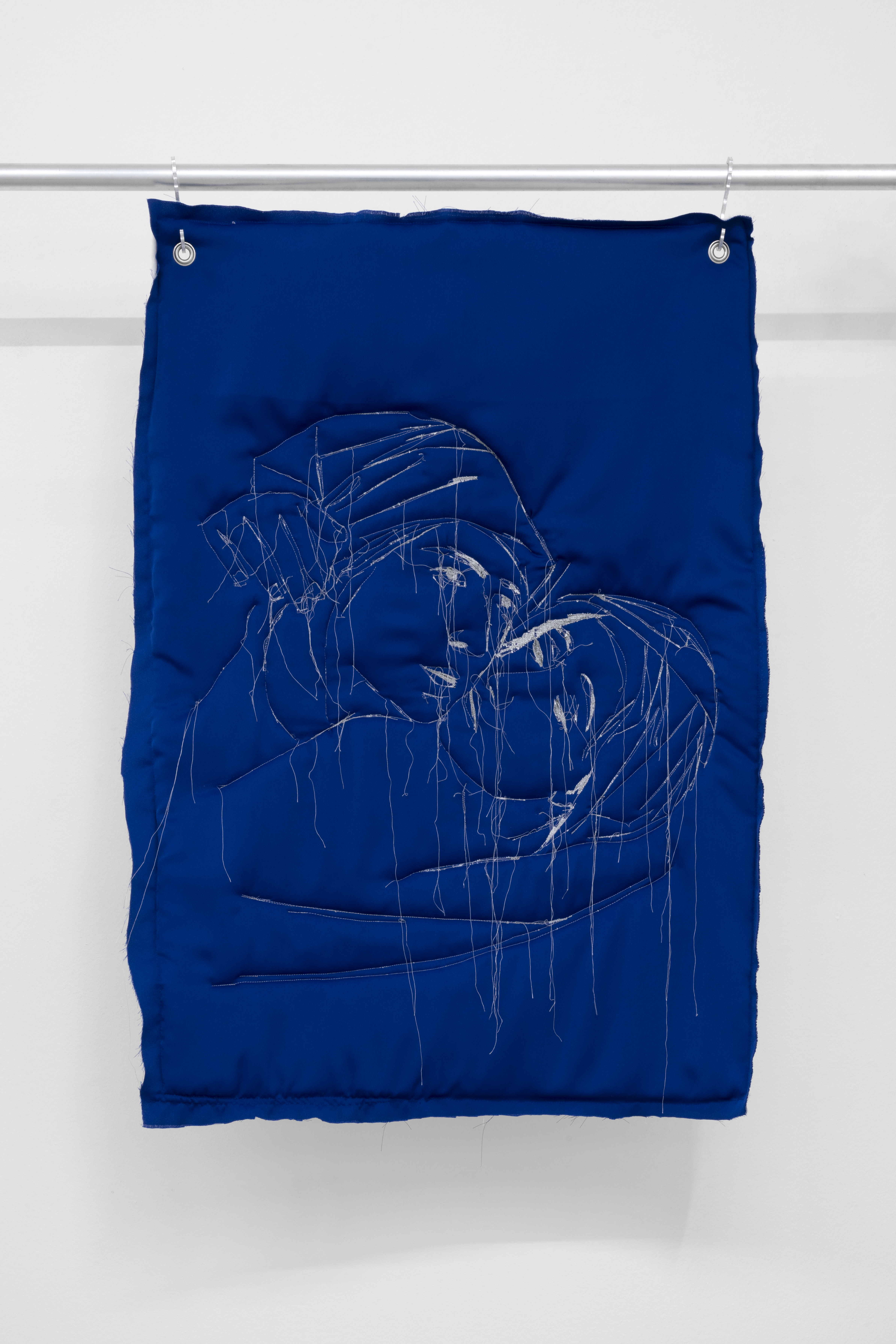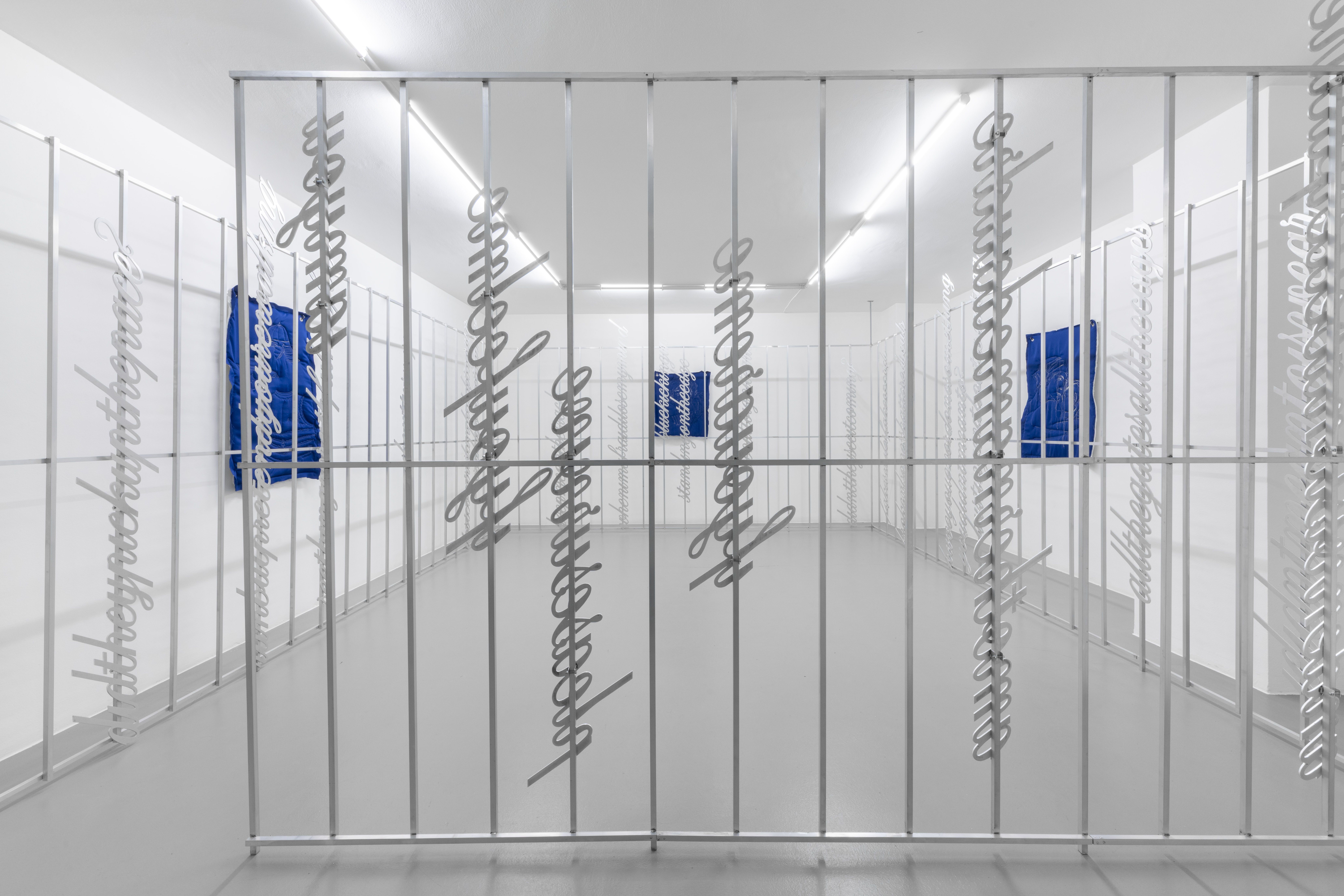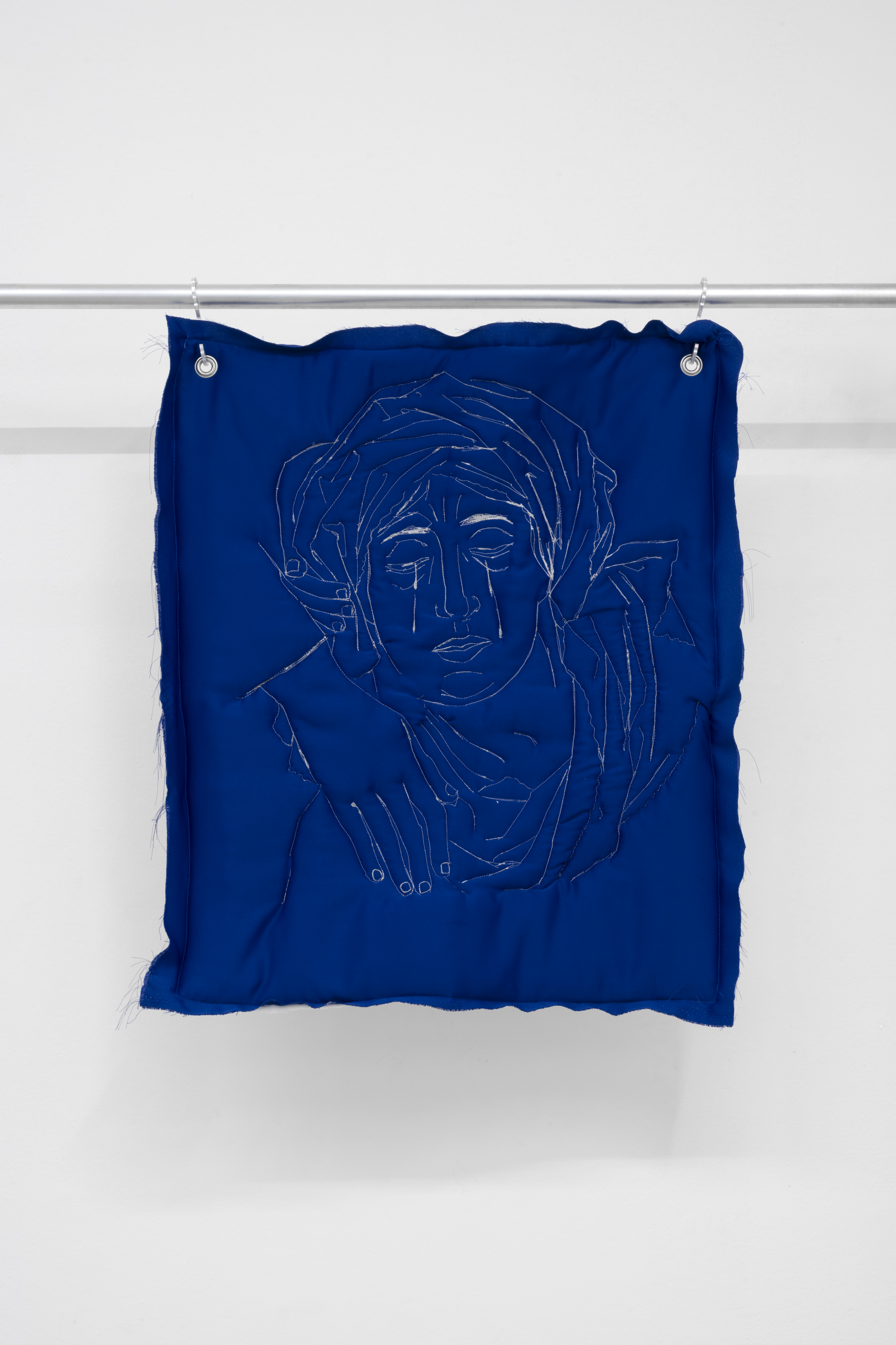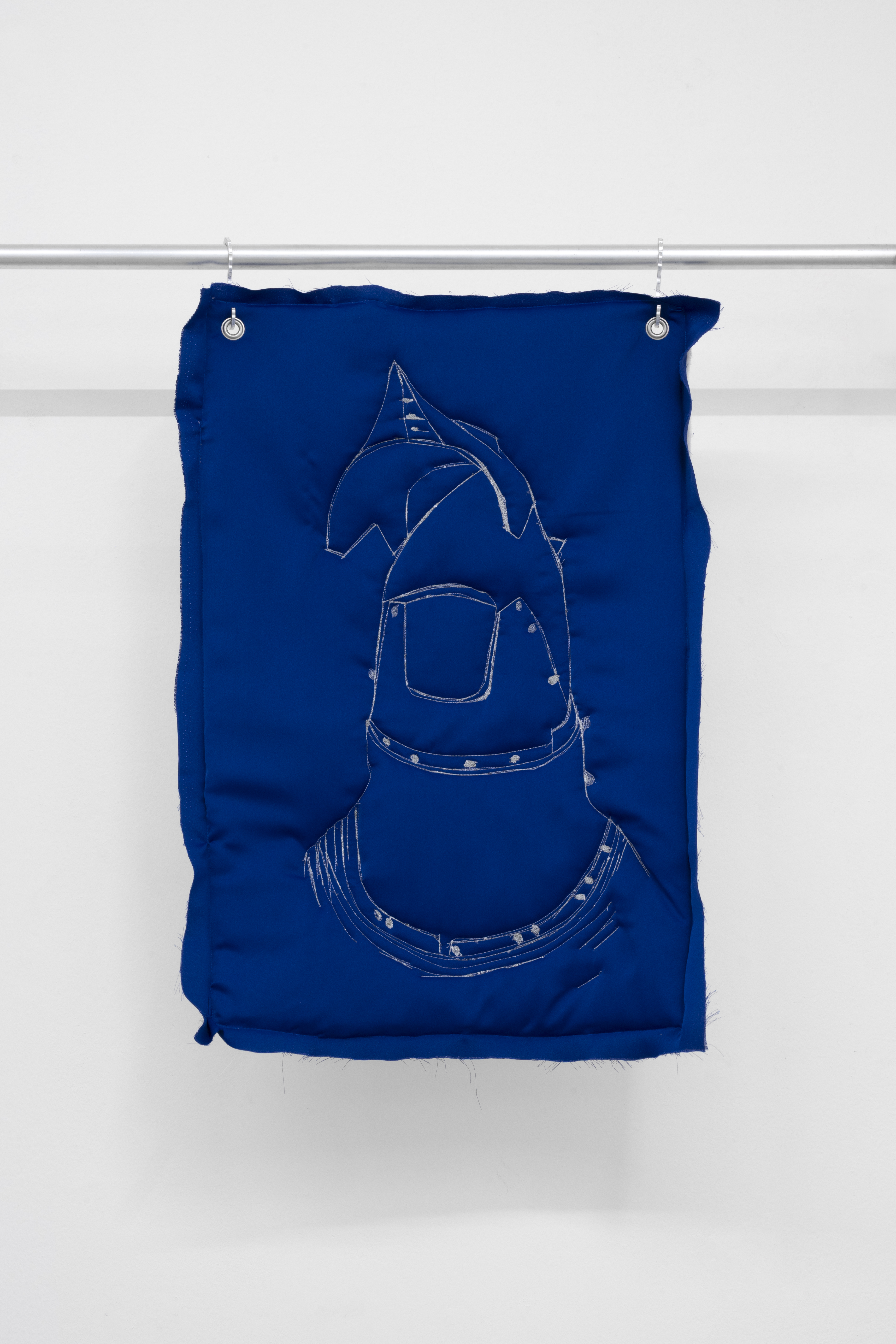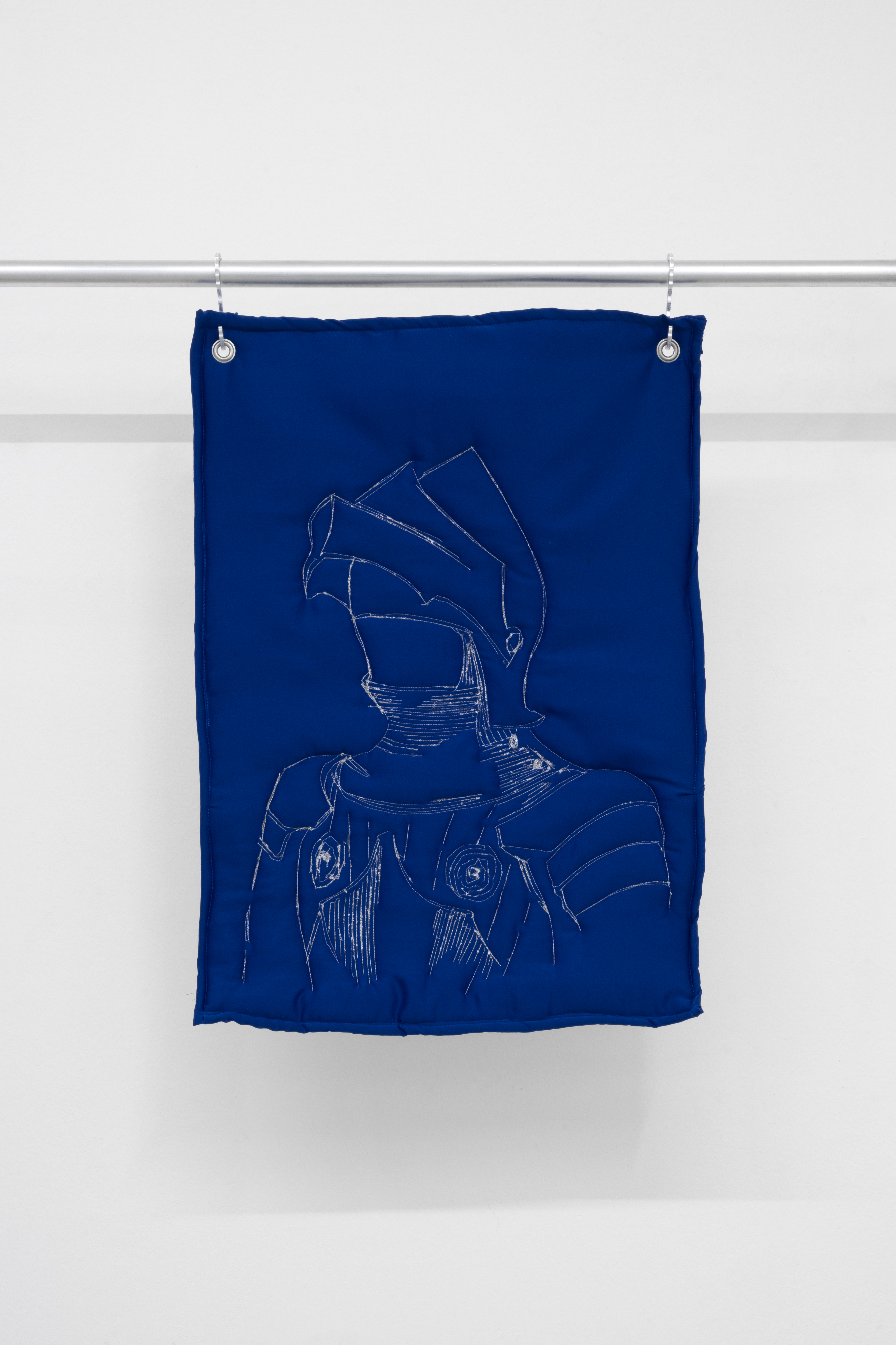 La mostra si sviluppa su due livelli. Al piano terra, grandi lavori trapuntati sono sospesi a strutture metalliche assemblate con tubi da impalcatura. Realizzate con diversi tipi di tessuti imbottiti e appese tramite ganci in alluminio tagliati al laser dall’artista, queste opere appaiono al tempo stesso morbide e difensive. Le loro superfici imbottite, nei toni del blu e del bianco, presentano disegni cuciti a macchina che raffigurano frammenti di armature medievali, come elmi e guanti. Sembrano quasi istruzioni per vestirsi, per preparare il corpo alla battaglia. Ogni trapunta diventa un’armatura, o una parte di essa, trattenendo al proprio interno la tensione irrisolta tra cura e difesa, vulnerabilità e aggressione.