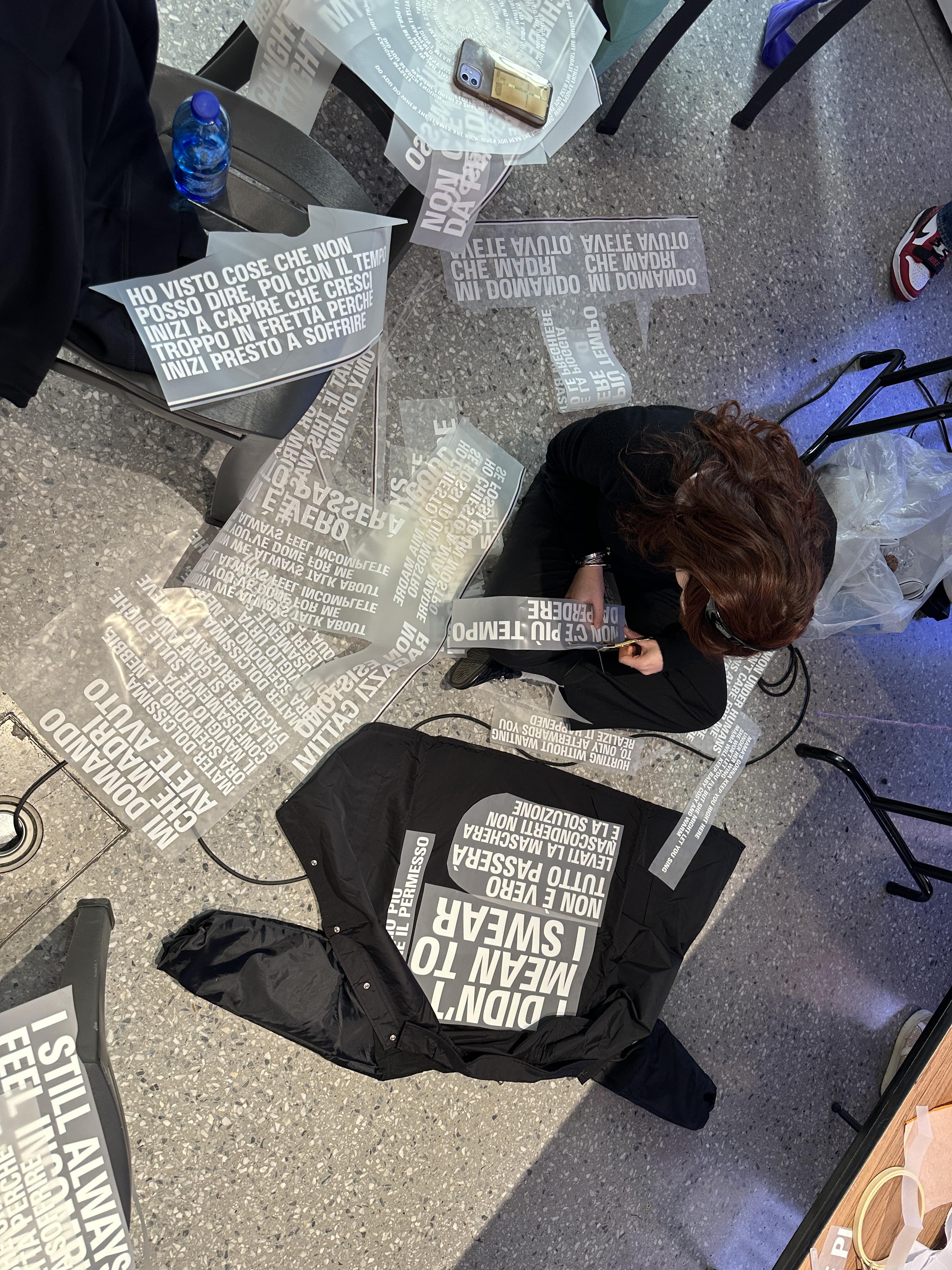 Sorry Mom x Orefici11 is the result of several workshops with a group of young people aged between 16 and 20, which ended with a performance featuring the workshop participants. During the workshop, many texts were analyzed, from which the young people extracted phrases that were used to customize the clothes they wore during the performance. The clothes were cut, embroidered, sewn and personalized with the phrases chosen during the workshop, which were transferred to the new clothes using thermo adhesive material.